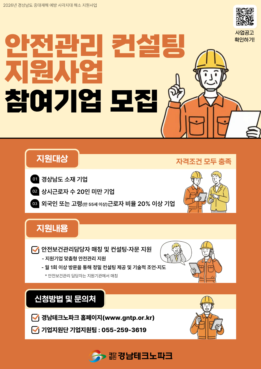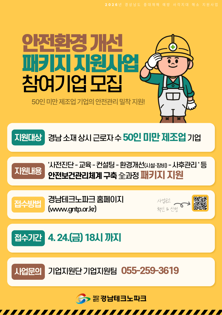 도내 고위험 영세 사업장의 중대재해 예방을 위해 「2026년 경상남도 중대재해 예방 사각지대 해소 지원사업」참여기업을 모집합니다. ① 안전환경 개선 패키지 지원 - 모집대상 : 경상남도 소재 상시 근로자 수 50인 미만 제조업 기업 - 지원내용 : '사전진단 - 교육 - 컨설팅- 환경개선 - 사후관리' 등 안전보건관리체계 구축 전과정 패키지 지원 - 모집기간 : ~ 4. 24.(금) - 신청방법 : 경남테크노파크 홈페이지 신청 - 패키지 신청 바로가기(클릭) ② 안전관리 컨설팅 지원 - 모집대상 : 경상남도 소재 상시 근로자 수 20인 미만 기업 중 외국인 또는 고령근로자 비율 20% 이상 기업 - 지원내용 : 사업장별 안전보건관리담당자 매칭 및 컨설팅 · 자문 지원 - 모집기간 : ~ 4. 24.(금) - 신청방법 : 경남테크노파크 홈페이지 신청 - 컨설팅 신청 바로가기(클릭) ③ 체험형 안전보건교육 지원 - 모집대상 : 경상남도 소재 중소기업 재직자(외국인 또는 고령 근로자) - 지원내용 : 체험형 안전보건교육(산업안전, 산업보건, 생활안전, 가상안전 등) - 모집기간 : 상시접수 - 신청방법 : 경남테크노파크 홈페이지 신청 - 체험형 교육 신청 바로가기(클릭) |